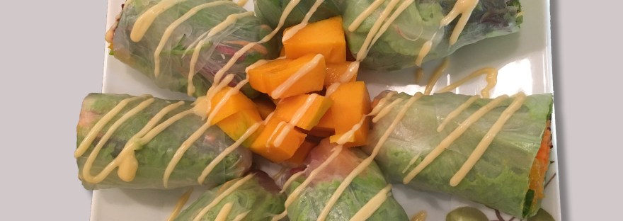 Fresh summer rolls in steamed rice paper wrap with local mango (seasonal availability), organic vegetables and herbs. Served with homemade dipping sauce and garnished with crushed peanuts.